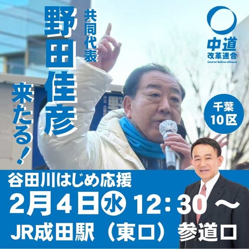 中道改革連合 野田佳彦共同代表が、谷田川はじめの応援に駆けつけます!