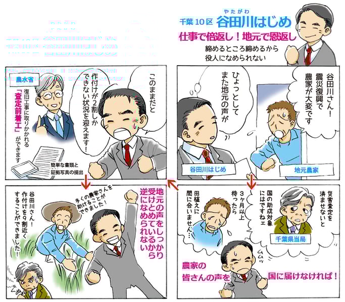 谷田川はじめが、2009年の衆議院議員選挙で重点公約にしていた「銚子市立病院」の再開。衆議院議員に当選後、与党厚労部会で積極的に発言し、2010年5月に「銚子市立病院」再開が実現した時の様子をマンガにしてみました。