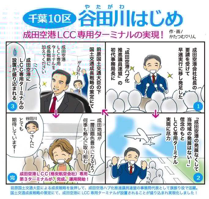 谷田川はじめが、成田空港 LCC専用ターミナル実現に向け、「成田空港ハブ化推進議員連盟」初代事務局長として取り組んだ時の様子をマンガにしてみました。